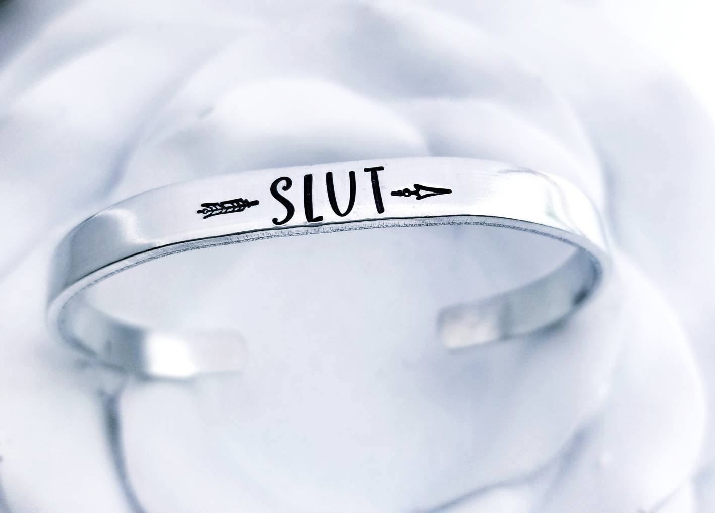 This silver cuff bracelet is stamped "SLUT" with an arrow going through it. The bracelet is hypoallergenic and will never tarnish. It's width is 1/4" and it fits wrists 5"-7.5".